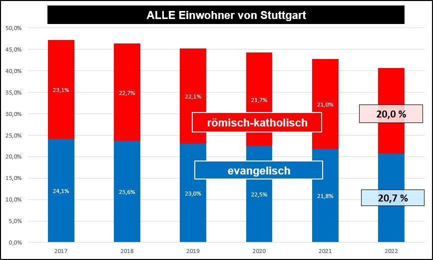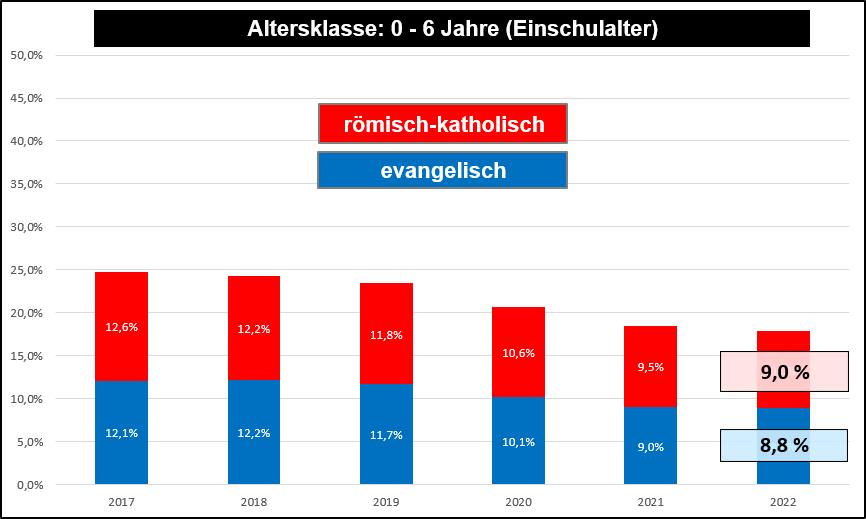 Bei den Kindern im Alter bis 6 Jahren (Schulanfänger) sind die Zahlen der Religionszugehörigkeiten signifikant geringer. Der Prozentsatz christlich getaufter Kinder ist etwa halb so hoch wie die Religionszugehörigkeit (rk und ev.) der gesamten Einwohnerschaft. Siehe Grafik a) mit der Entwicklung der Religionszugehörigkeit der Einwohner von Stuttgart und b) der Kinder in dem Alter bis 6 Jahren. In Stuttgart sind in der Altersklasse bis 6 Jahren 17,8 Prozent christlich getauft, d.h. 82,2 Prozent haben keine oder eine andere Religionszugehörigkeit. Diese Verhältnisse gelten nicht nur für Stuttgart. Anfragen in anderen Städten von Baden-Württemberg bestätigen, dass die Religionszugehörigkeit der Kinder bis 6 Jahren in etwa halb so hoch ist wie die Religionszugehörigkeit der gesamten Einwohner der jeweiligen Stadt.